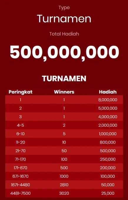 4. Sebanyak 7.500 pemenang akan mendapatkan hadiah senilai Rp 500.000.000 yang akan dipilih secara acak dalam turnamen ini.