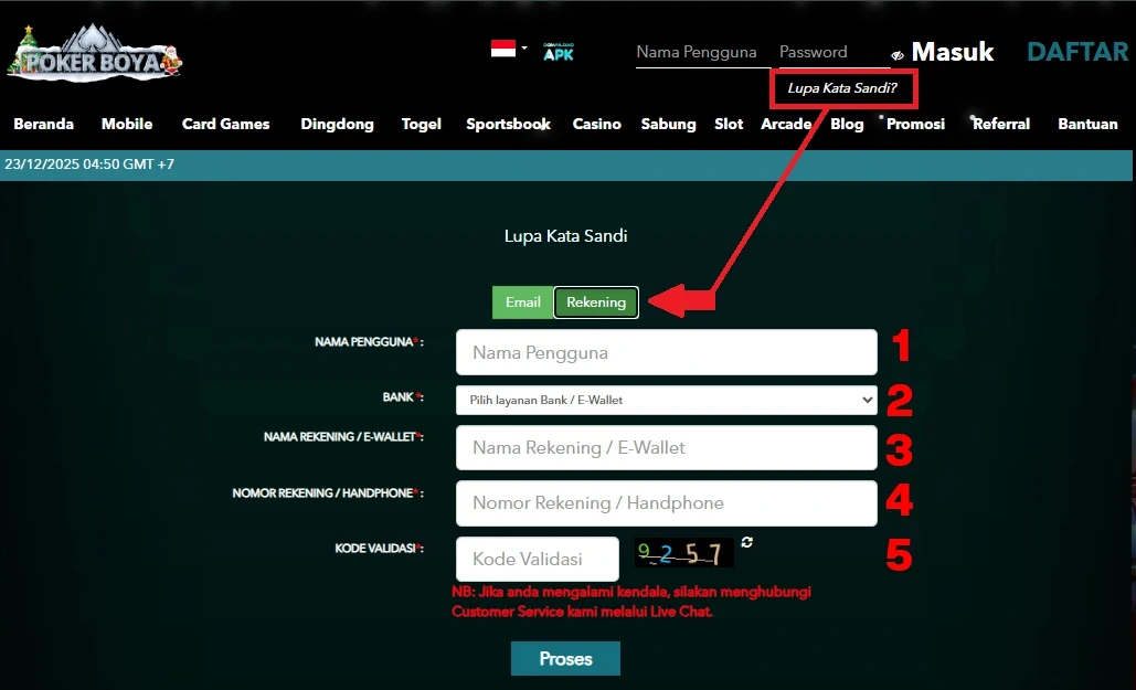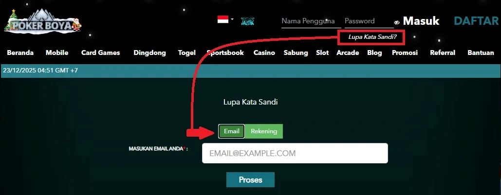 Silakan klik menu Lupa Kata Sandi jika lupa kata sandi ID anda, dimana terdapat 2 pilihan untuk menggunakan menu lupa password dengan pilihan E-mail ataupun dengan Rekening
